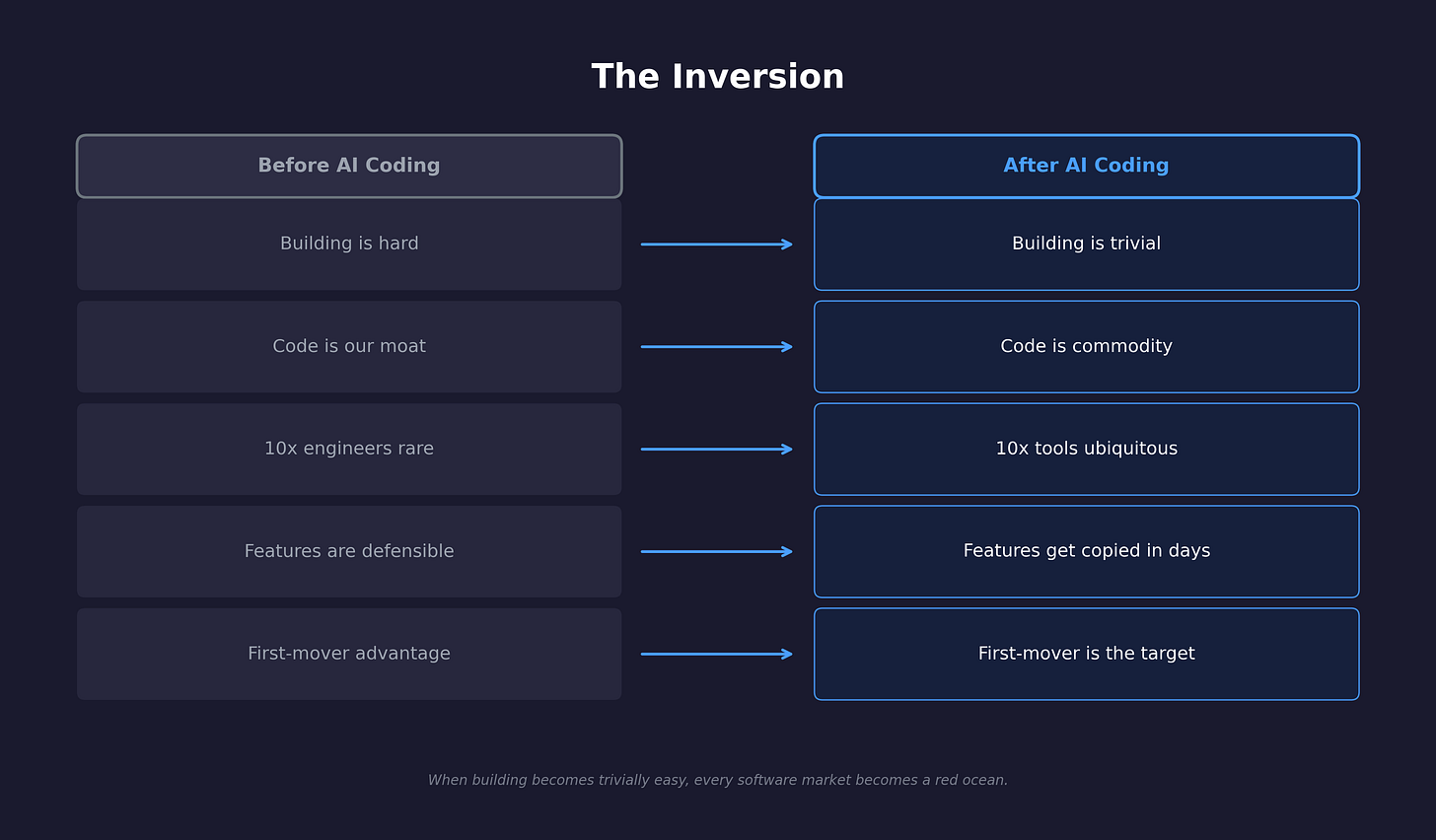 A founder I spoke with last month put it bluntly: “We used to worry about whether we could build it. Now we worry about whether we can survive the twelve competitors who’ll ship the same thing next week.”
